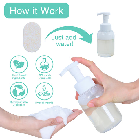 Fill 8 oz of warm water into a foaming dispenser bottle.